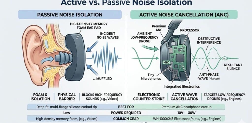 - Passive Noise Isolation: Uses physical materials (like foam or leather) to block sound waves. It’s like a physical shield for your ears.
