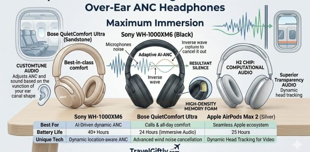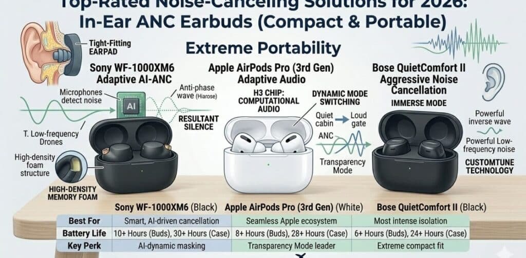 - Sony WF-1000XM6: Features AI-driven ANC nearly as powerful as over-ear models.