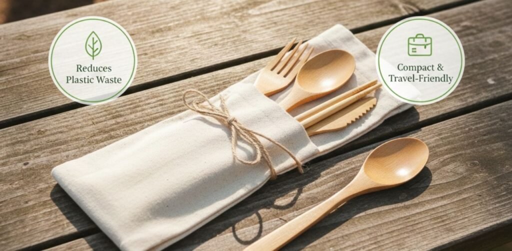 Say goodbye to disposable plastic forks. A lightweight bamboo or titanium cutlery set is perfect for meals on the go.