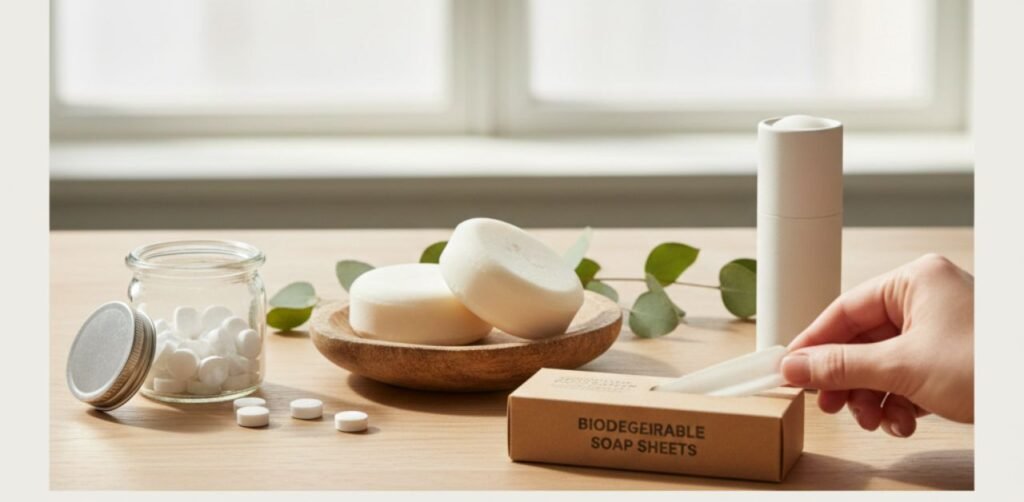 • Biodegradable Soap Sheets: Ideal for quick hand washes when public restrooms lack soap.