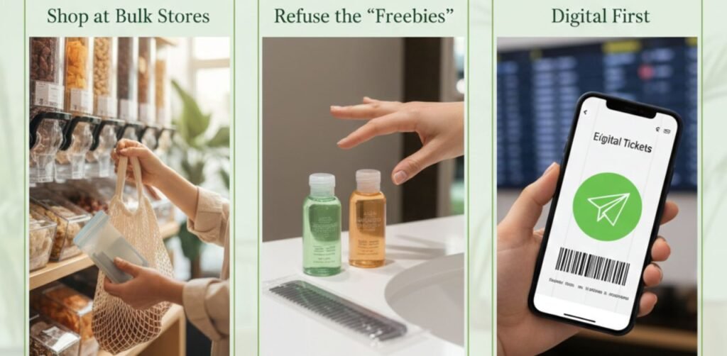 2. Refuse the “Freebies”: Politely decline hotel mini-toiletries and plastic-wrapped airline blankets.