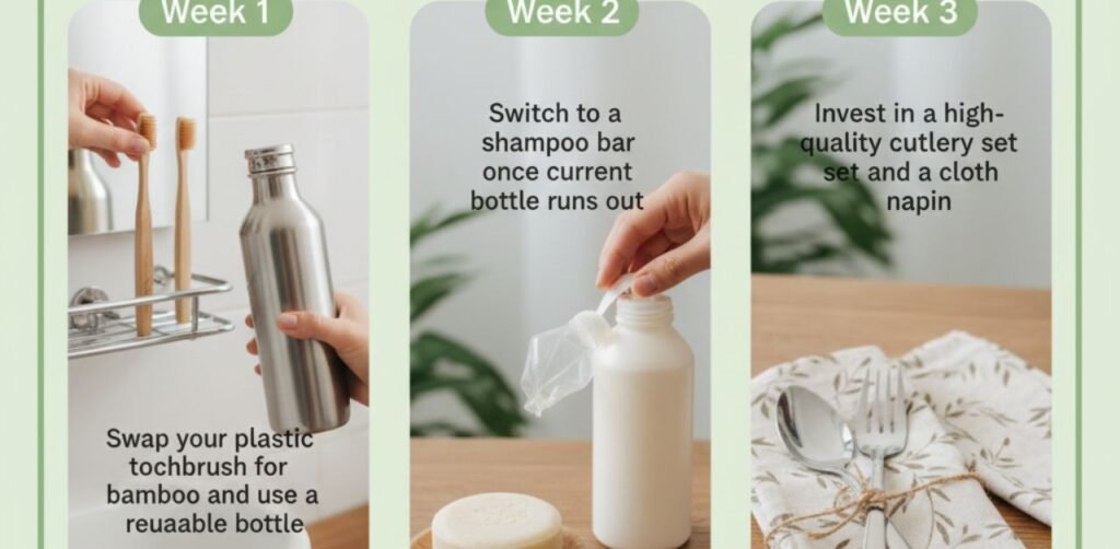 1. Week 1: Swap your toothbrush for bamboo and find a reusable bottle at home.