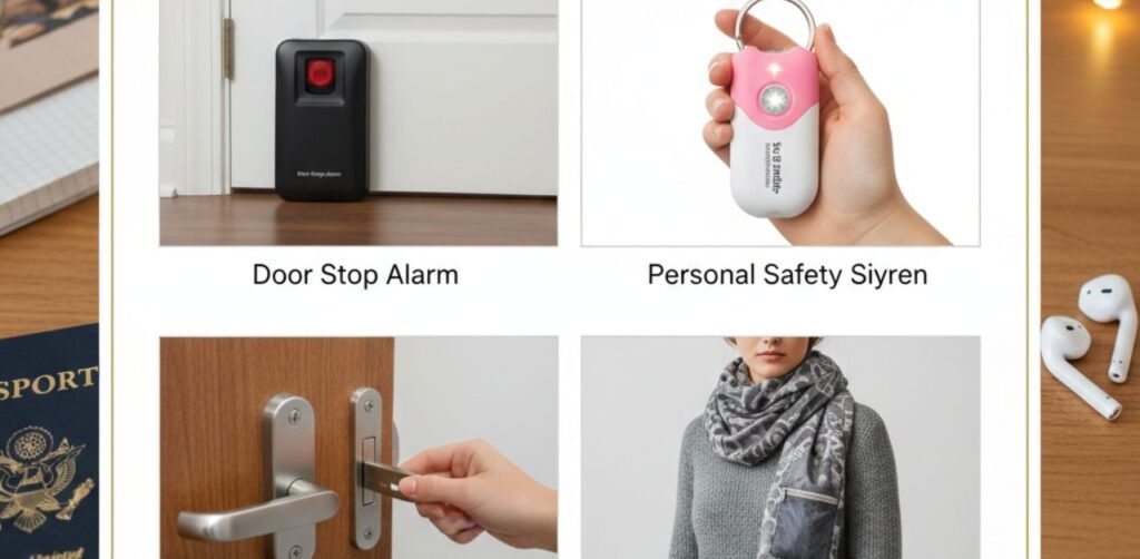 • Door Stop Alarm: A compact device that wedges under your hotel or Airbnb door. It sounds a loud siren if anyone tries to enter.