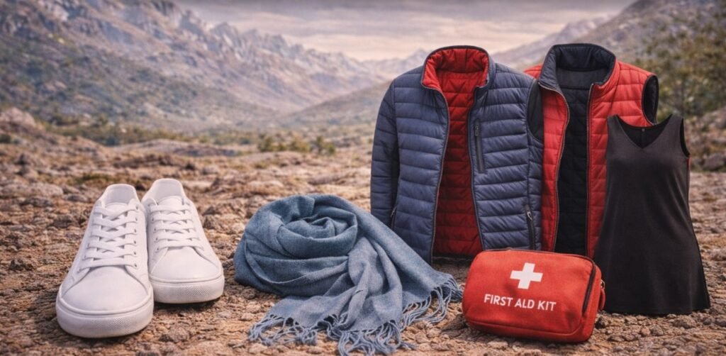 • Compact First Aid Kit: Always carry antiseptic wipes, blister pads, painkillers, and a supply of your personal prescriptions.
