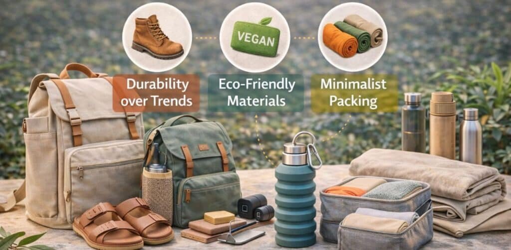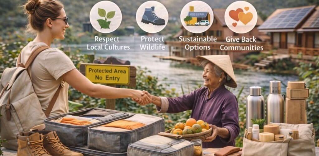 • Minimalist Packing: Bringing only what you need reduces travel weight and transportation emissions.